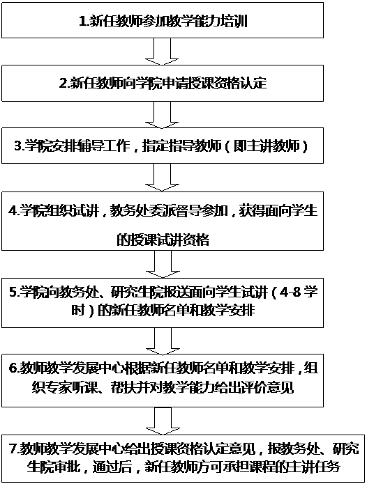 第五条 人力资源部负责组织实施新教师岗前集中培训;教师教学发展中心负责组织专家对新任教师授课资格进行认定;教务处、研究生院负责新教师授课资格审批。
