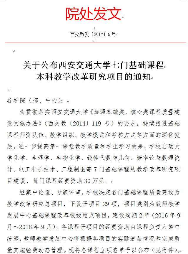 | 关于公布西安交通大学七门基础课程本科教学改革研究项目的通知【详细】 |